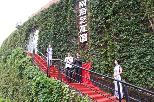 海南科技职业大学校长张洪田教授(右二)、海南省美术家协会阮江华主席(左二)共同为南海艺术馆揭牌。