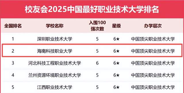 校友会2025中国最好职业技术大学排名10强榜单,海南科技职业大学位居第二。