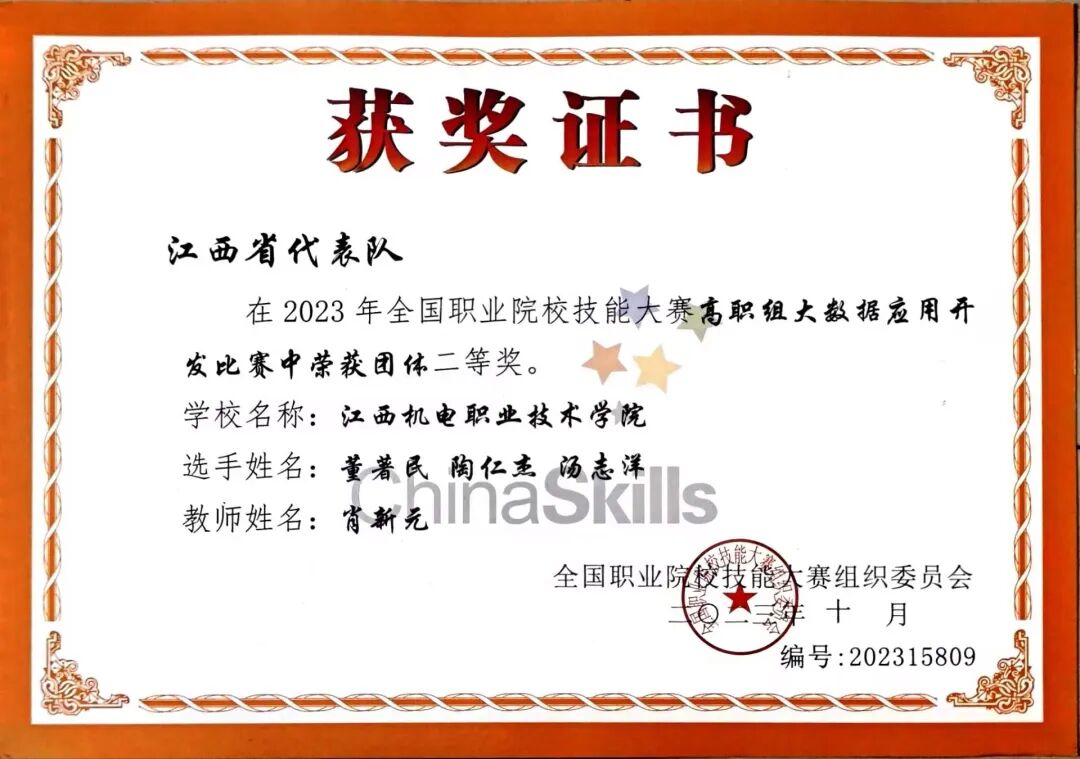 2023年10月22日至24日,信息工程学院肖新元老师带领董著民、汤志洋和陶仁杰同学参加2023年全国职业院校技能大赛高职组“大数据应用开发”赛项师生同赛项目中荣获国家级二等奖。