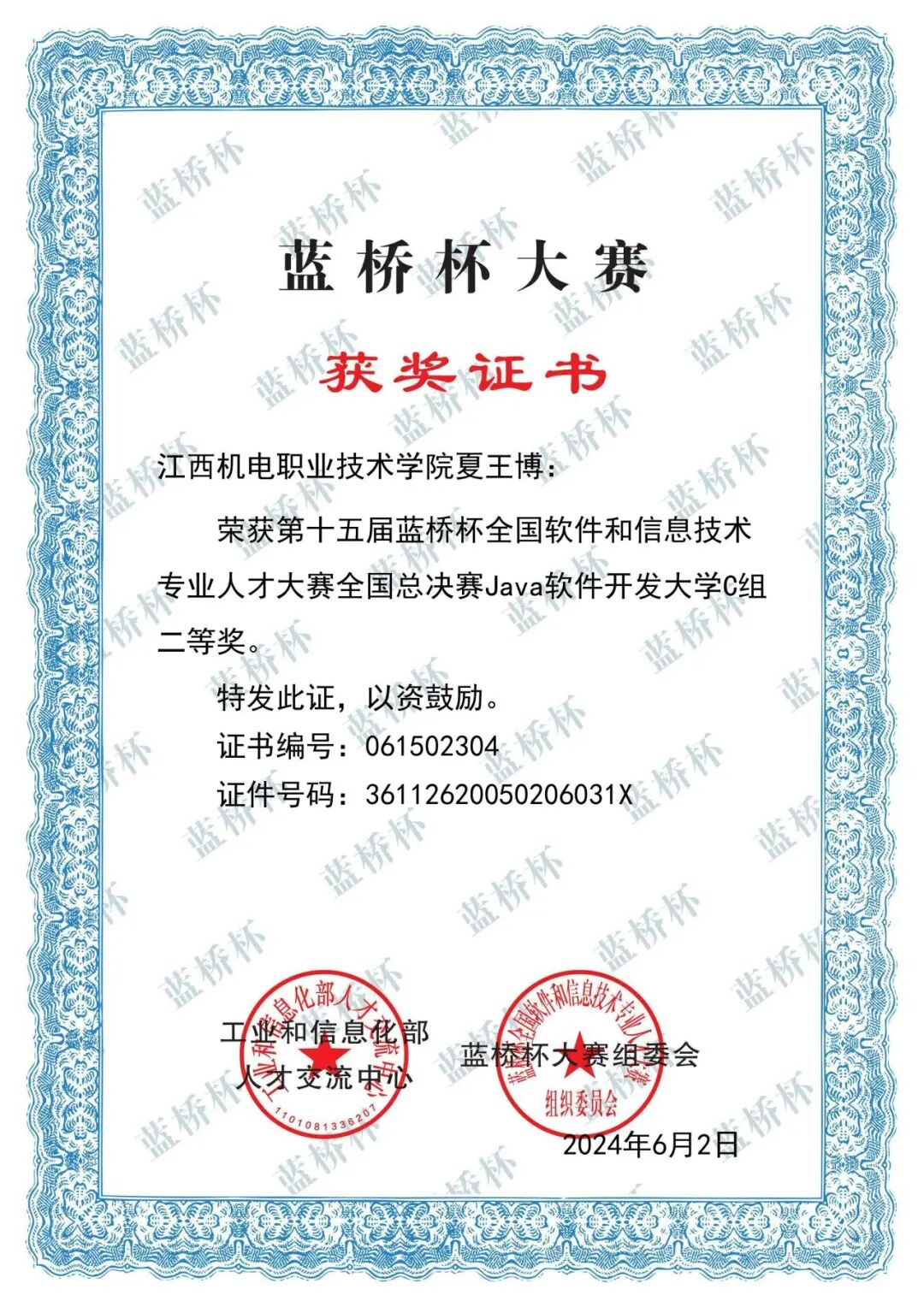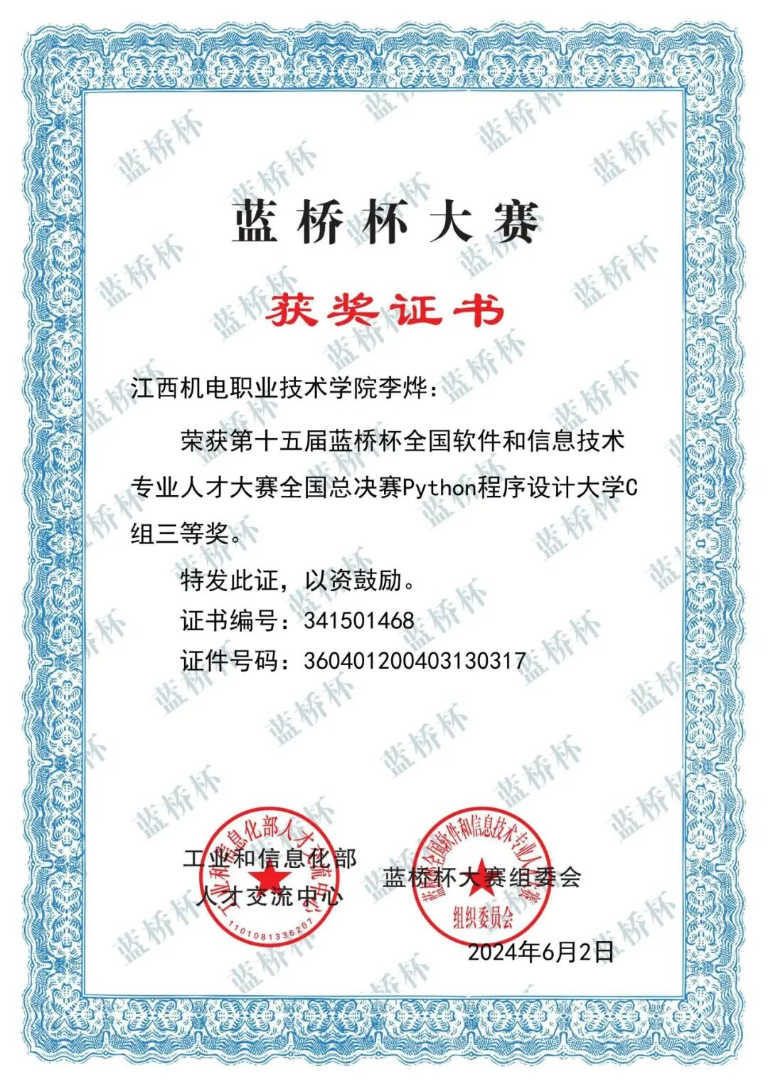 董著民,在校期间他努力掌握专业知识和技能,不断提高自己的综合素质和创新能力,获得国家励志奖学金及多项校设奖学金。曾获全国职业院校技能大赛高职组“大数据应用开发”赛项团体二等奖、江西省职业院校技能大赛高职组“大数据应用开发”赛项团体一等奖、第十四届蓝桥杯全国软件和信息技术专业人才大赛全国总决赛Python程序设计大学C组三等奖、第十四届蓝桥杯全国软件和信息技术专业人才大赛江西赛区Python程序设计大赛C组一等奖等荣誉。