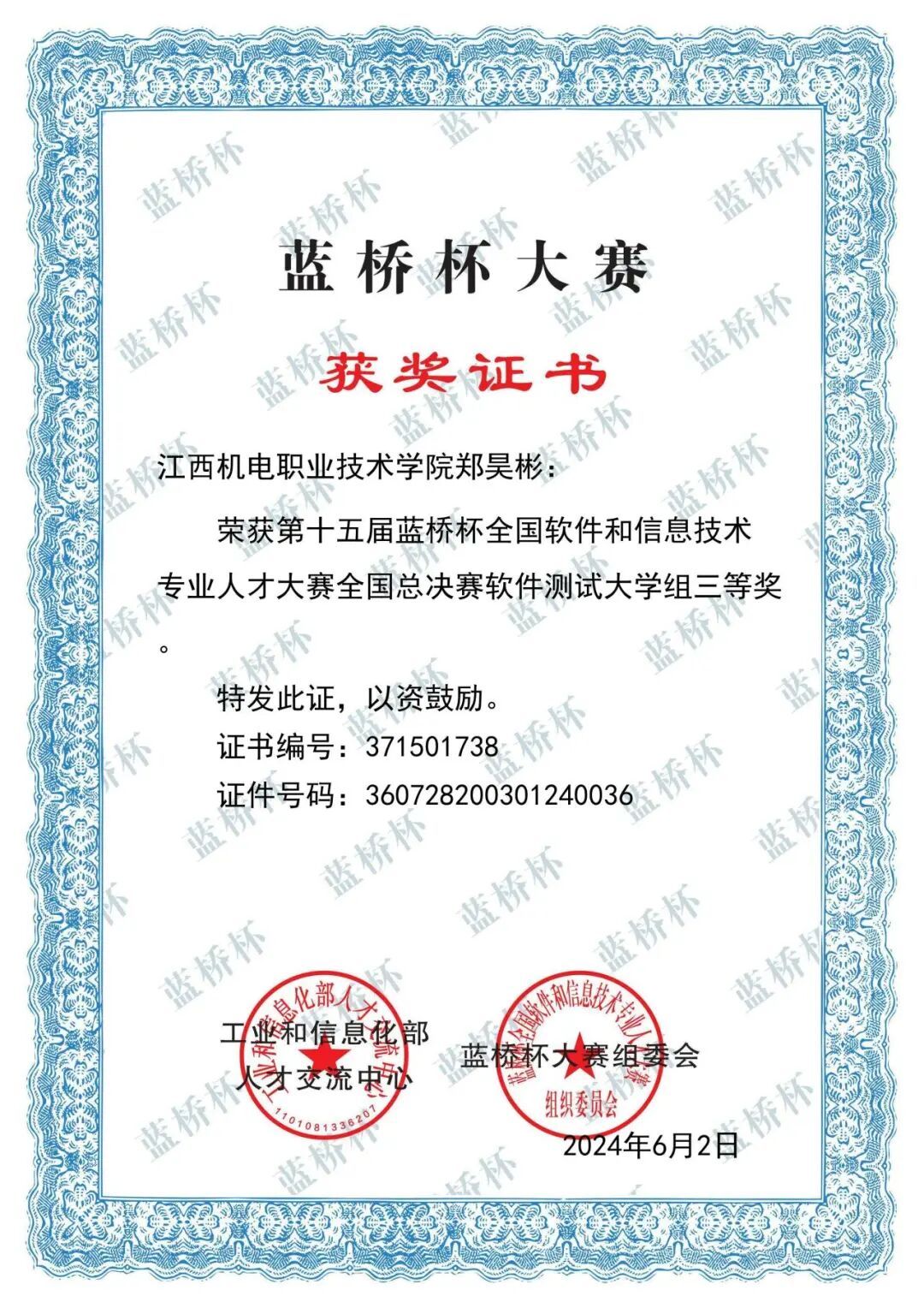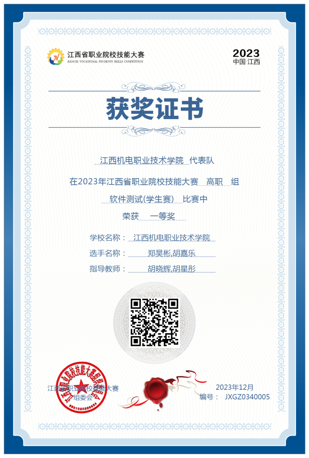 2023年12月23日,信息工程学院胡星彤、胡晓辉老师指导胡嘉乐、郑昊彬同学在2023年江西省职业院校技能大赛“软件测试”赛项中荣获一等奖。