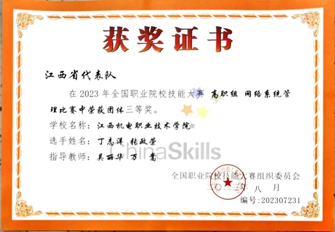 2023年8月20日至22日,信息工程学院吴丽华、万嵩老师指导的张政荣、丁志洋同学在2023年全国职业院校技能大赛高职组“网络系统管理”赛项中荣获国家级三等奖。
