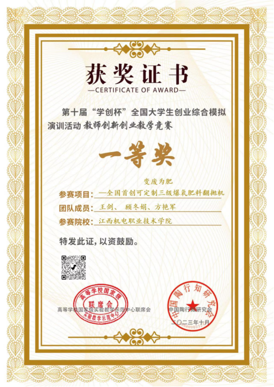 2023年10月22日,信息工程学院顾冬娟参赛团队在2023年“学创杯”全国大学生创业综合模拟演训活动教师创新创业教学竞赛总决赛中荣获国家级一等奖。