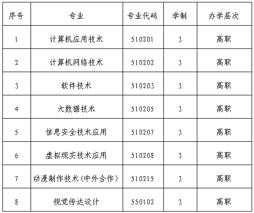 学院下设计算机应用教研室、计算机网络教研室、软件技术教研室、视觉传达教研室和数字媒体教研室5个教研室,开设计算机应用技术、计算机网络技术、软件技术、大数据技术、信息安全技术应用、动漫制作技术(中外合作)、视觉传达设计、虚拟现实技术应用8个专业。其中计算机应用技术专业先后被教育部《高等职业教育创新发展行动计划2015—2018年》认定为国家级“骨干专业”、被省教育厅评为江西省高水平高等职业院校优势特色专业。2023年5月,学校认定为江西省第二轮高水平高职学校计划建设单位,计算机应用技术专业群为“双高”专业群。经江西省教育厅批准、教育部备案,我校与马来西亚王子国际学院合作办学,学院的“动漫制作技术”专业举办中外合作高等专科教育,列入国家统招招生计划。2022年开始,我校与东华理工大学签订协议,开展本科层次技术技能型人才联合培养工作,其中学院的计算机应用技术专业对接东华理工大学的计算机科学与技术专业。